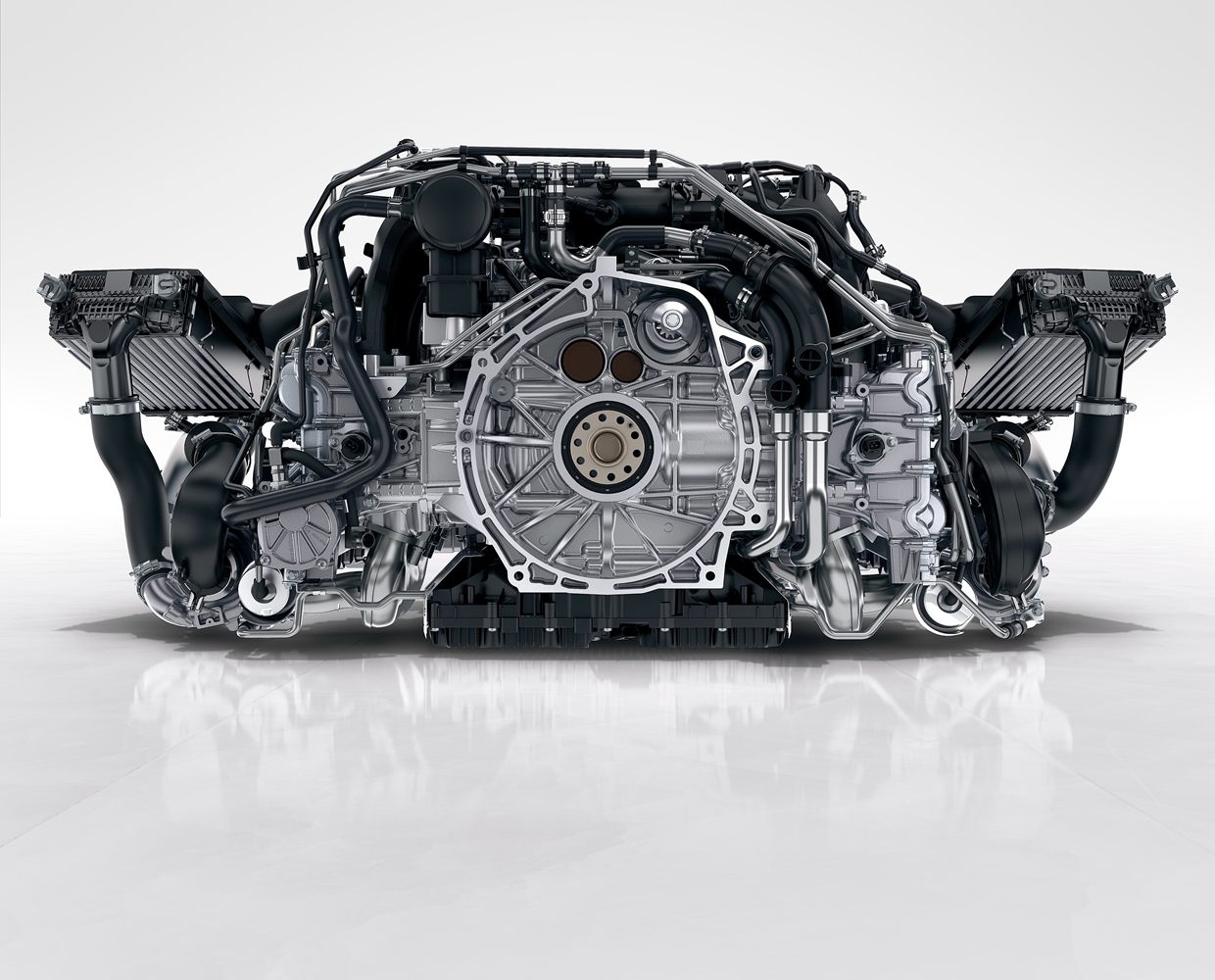 A new cylinder wall coating process, in which a plasma beam coats the bore surface with iron, helps reduce friction losses, according to Porsche engineers. And extensive FEA analysis during the design process helped cut the weight of the aluminum crankcase by 1.5 kg (3.3 lb). A new engineered-plastic oil pan is 2 kg (4.4 lb) lighter than in the previous generation engines.