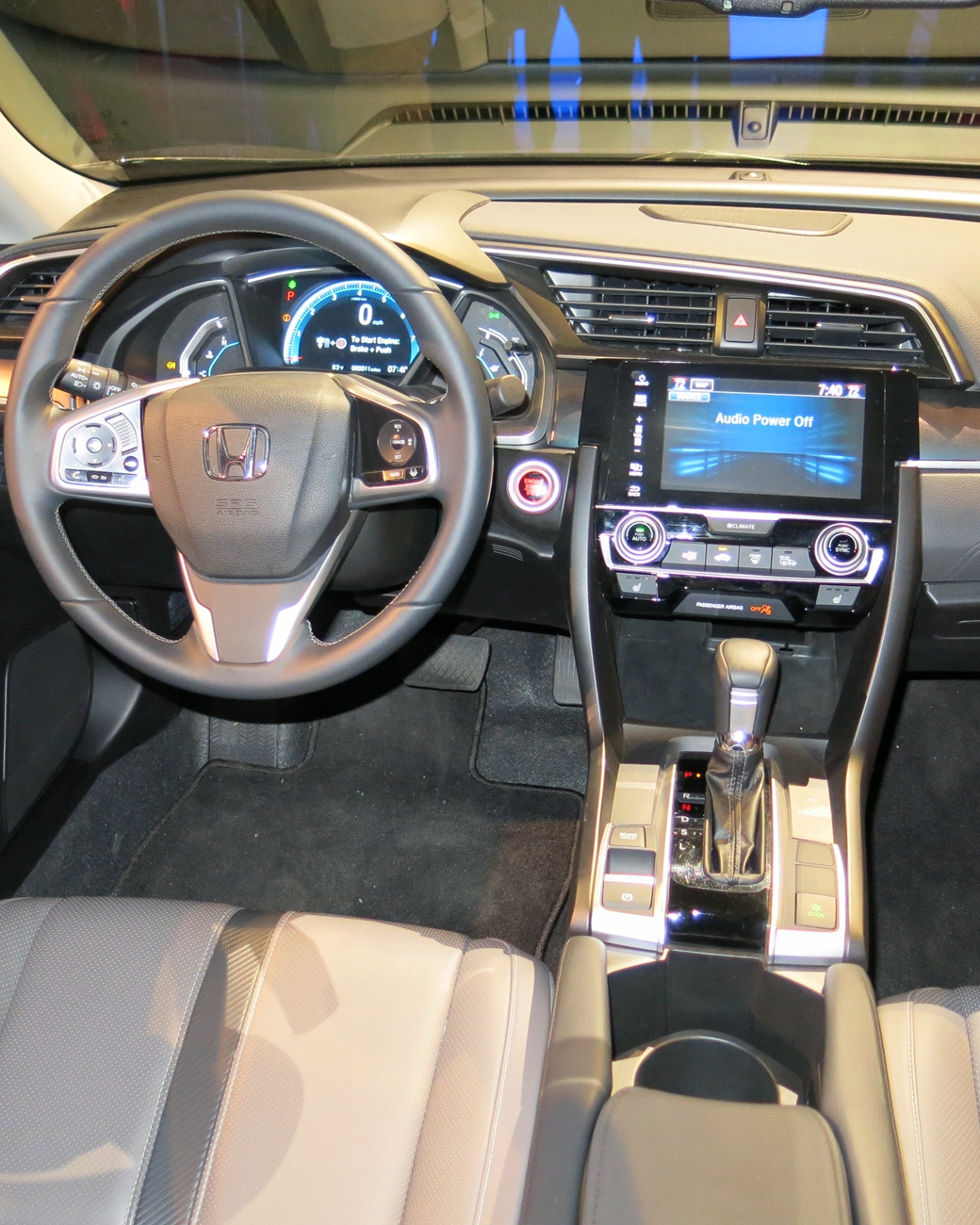 Civic uses the latest version of the company’s so-called ACE (Advanced Compatibility Engineering) body structure that is claimed to be 26% stiffer in torsion than the previous car and incorporates 12% ultra-high-strength steel. Attention was paid during early layout to returning to the classic Honda low-cowl driving position. To achieve this, the driver’s H-point was lowered by 20 mm (0.8 in) to bring it to the same level as Audi’s TT. Height of the floorpan, instrument panel, and engine mounts were commensurately reduced. Cabin volume is increased by a claimed 3.7 ft3 (105 L), with 2 in (51 mm) more rear legroom. Trunk space is 2.6 ft3 (74 L) larger than that of the 2015 model.