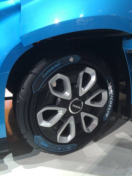 此外,概念卡車的互聯(lián)技術(shù)還延伸至米其林提供的超未來感輪胎。據(jù)了解,米其林XLine Energy是第一款被授予AAA級滾動(dòng)阻力表現(xiàn)的輪胎,可幫助長途貨車節(jié)省燃料(1L/100km)。每一個(gè)X Line Energy輪胎均內(nèi)置RFID標(biāo)志。駕駛員可憑借該標(biāo)志追蹤該輪胎在整個(gè)生命周期內(nèi)的使用情況,并實(shí)時(shí)查詢類型、尺寸、型號、磨損、性能或胎溫等信息。此外,配合輪轂上的傳感器,胎壓監(jiān)測系統(tǒng)還可以提供胎壓數(shù)據(jù)。這些信息中的部分或所有均可以在有必要時(shí)顯示在駕駛室內(nèi),為駕駛員提供警示。