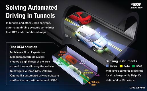It is Mobileye’s latest vision-sensing hardware and software, however, that is at the center of the Delphi CLSP system’s sensor-fusion and software capabilities—particularly the REM software “overlay” on its EyeQ 4/5 System-on-a-Chip microprocessor. This enables the camera-vision capabilities alone to position the vehicle with a 10-cm (3.9 in) accuracy—even in the absence of a Global Positioning System (GPS) signal.