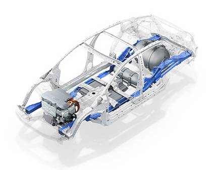 2017款Clarity燃料電池汽車的尖端動(dòng)力傳動(dòng)系統(tǒng)離不開本田的一個(gè)全新平臺(tái)。這個(gè)平臺(tái)似乎沒有特別的名字,但采用了“直線型車架”結(jié)構(gòu),可以最大化車艙空間、減少重量并為這款燃料電池汽車提供更加優(yōu)化的行駛動(dòng)力表現(xiàn)(純電動(dòng)/混合電動(dòng)Calrity系列產(chǎn)品,尚待定)。與現(xiàn)行版混動(dòng)雅閣相比,這款全新平臺(tái)的重心降低了4 in (10 cm) ,經(jīng)過專門設(shè)計(jì),可以支撐鋁制內(nèi)襯碳纖維/玻璃纖維儲(chǔ)氫罐(世界第一)的重量。