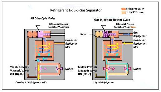 The partly-condensed gas from the internal condenser then flows through an electric expansion valve for further decompression,and into the ultra-compact liquid-gas separator that is a key part of the refrigerant gas injection system. This gives this heat pump circuit extra performance in the heating mode.