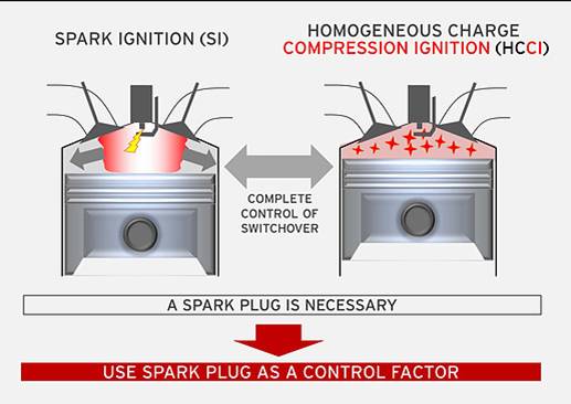“We selected 15:1 compression ratio as it is close to compression-ignition conditions in normal ambient temperatures,” explained Powertrain Executive Officer Ichiro Hirose. “The spark creates an expanding fireball that acts like a secondary 'air spring' to create additional compression. Because the spark plug creates this fireball, it effectively controls the switch between spark ignition and compression ignition,” he noted.