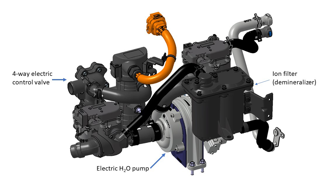 Like the Nexo, the Kona EV prototype uses an AirSide PTC – this time a 5-kW unit – along with a 2.7-kW heat pump. A more powerful PTC is needed because there's no waste heat from a fuel cell stack to help warm the cabin. The Kona EV does manage to siphon some heat energy off of the electronic components, including the motor.