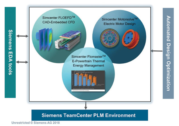 The new integrated CAE solution package combines three of Simcenter’s CAE simulations: FLOEFD for 3-D thermal analysis; MotorSolve for electric motor design, and Flomaster, a 1-D CAE for electric powertrain thermal energy management. All three are now linked—for component thermal and electric powertrain performance, connectivity between simulation of electric motor performance and system simulation for electrical and thermal management.