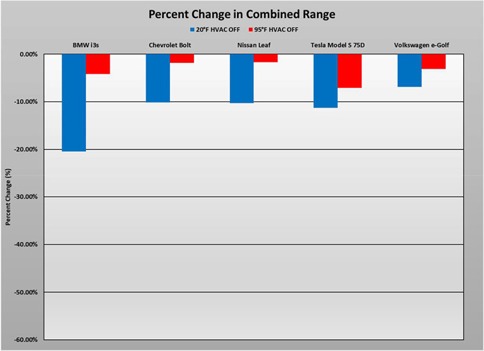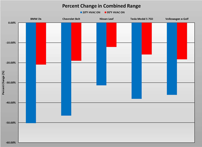 “We found that the impact of temperature on EVs is significantly more than we expected,” said Greg Brannon, AAA’s director of automotive engineering. “It’s something all automakers are going to have to deal with as they push for further EV deployment because it’s something that could surprise consumers.” The organization tested five separate models: the BMW i3, the Chevrolet Bolt EV, the Nissan Leaf, the Tesla Model S and the Volkswagen e-Golf. AAA engineers subjecting each car to both 20-degree F cold and 95-degree F heat.