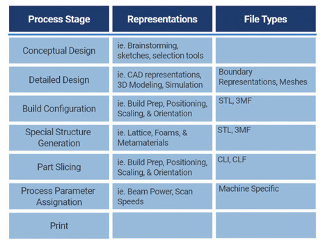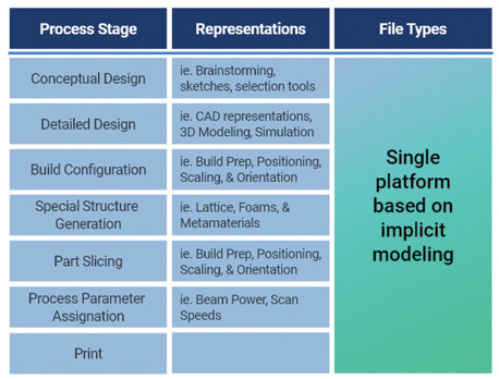 A typical workflow when designing for AM starts with a conceptual design that gets represented in CAD software and is translated step-by-step to ultimately be configured for manufacturing. Changes to the part’s design or geometry in CAD require significant rework in order to get back to a print-ready configuration. Iterating back through one of these stages has an associated cost due to the rework required to adapt the models at each subsequent stage.