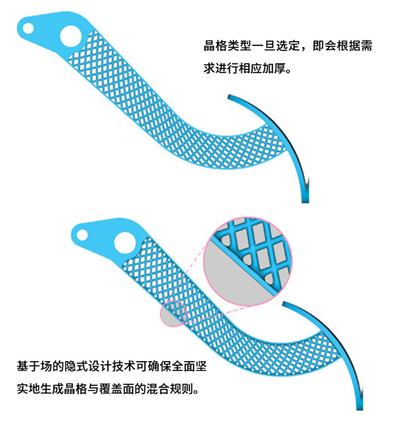 首先,我們需要確定腳踏板大致的幾何結(jié)構(gòu)。為了給這個(gè)部件減重,我們將借助該開(kāi)發(fā)框架下的晶格工具,充分嘗試不同的晶格構(gòu)造。接著,設(shè)計(jì)人員會(huì)根據(jù)零部件對(duì)硬度的要求,對(duì)各個(gè)晶格類(lèi)型進(jìn)行加厚,并將其疊加至原始模型。