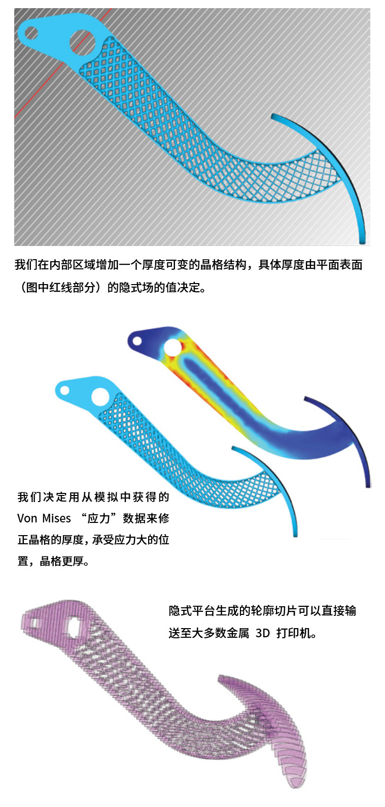 在隱式建模開(kāi)發(fā)框架下,我們可以更加充分地利用場(chǎng)工具,不僅僅是通過(guò)距離場(chǎng)來(lái)構(gòu)建幾何結(jié)構(gòu),還能借助各種各樣的場(chǎng)(數(shù)據(jù))構(gòu)建晶格的中觀結(jié)構(gòu),比如應(yīng)力、熱和流體模擬數(shù)據(jù)。實(shí)際上,您可以使用任何類(lèi)型的數(shù)據(jù)構(gòu)建您想要的幾何結(jié)構(gòu)。在設(shè)計(jì)剎車(chē)腳踏的例子中,我們決定使用工程師提供的Von Mises 應(yīng)力數(shù)據(jù)來(lái)修正晶格的厚度。