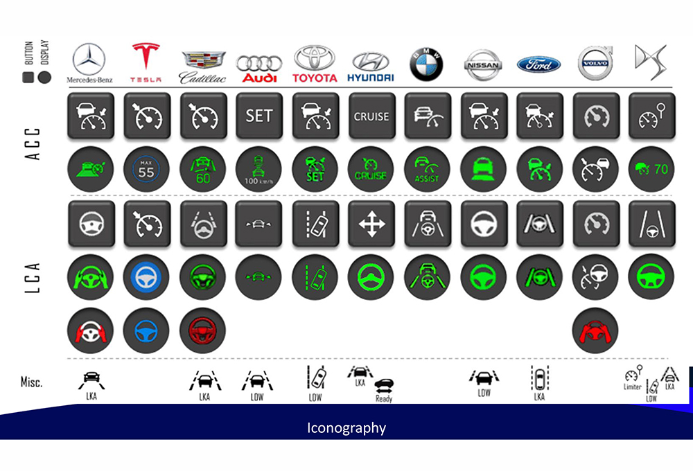 Shaw, a member of the SAE committee on controls and display standards, said one of the group’s goals is to standardize icons – as much as possible – across OEMs. One problem, she said, is that “OEMs want to have their own design. You want to get in a car and know it's a Mercedes or know it’s a Ford. You don't want to be confused between the two. It should look different. It should feel different. But can we make these icons and buttons [more recognizable]?” Shaw cited cruise-control buttons and indicators as one example. “All of them seem to have a speedometer icon, except for two. And then one of them has what I call a lollipop. It’s actually a traffic sign. One of them has a car; a couple have arrows. All of these are the button you use to turn on cruise control, BlueCruise, Super Cruise, whatever cruise you're working on, adaptive or not. And then when you get into the screen, they all show you something different.” And then, some of them mean cruise is on and engaged, and some indicate the speed that is set. “They’re mostly all different,” she said. “If you’re getting in a rental car, do you know that the feature is engaged?”