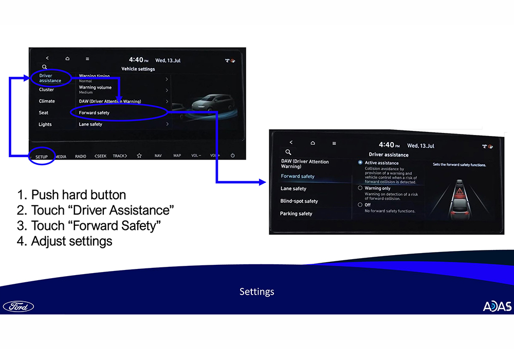 Shaw also mentioned the byzantine nature of some vehicles’ ADAS settings menus. For instance, while it might take two button presses on one vehicle to adjust the sensitivity of forward braking, it can take far more on another. And they may be behind different menu names, such as “driver assistance” or “additional settings.”