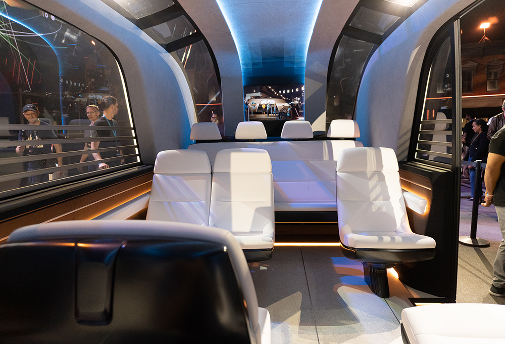 SAE Media had a chance to ride in the Cybercab. Its small stature and gullwing doors did feel in place in the faux-city Tesla put together on the Warner Bros. lot. The interior was roomy for two people, and the seats were comfortable. The lack of a steering wheel or pedals, while not alarming in the operating domain of a movie set with prescribed routes without the hustle and bustle (and dangers) of a real city, could make some of the public pause before riding.