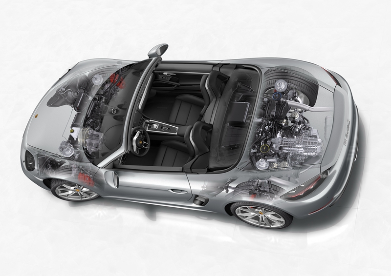 The new 718 may look externally similar to the outgoing model but in fact it is very extensively, if subtly, changed. All panels and exterior components except its folding fabric roof (operating time to open or shut: 9 s at speeds up to 50 km/h) and its windshield, are different, giving the car a tauter look and an enhanced road presence. The car’s nose is lower and very large air front intakes are used. Fenders and side sills are re-styled and wheels are 19-in standard, 20-in optional.