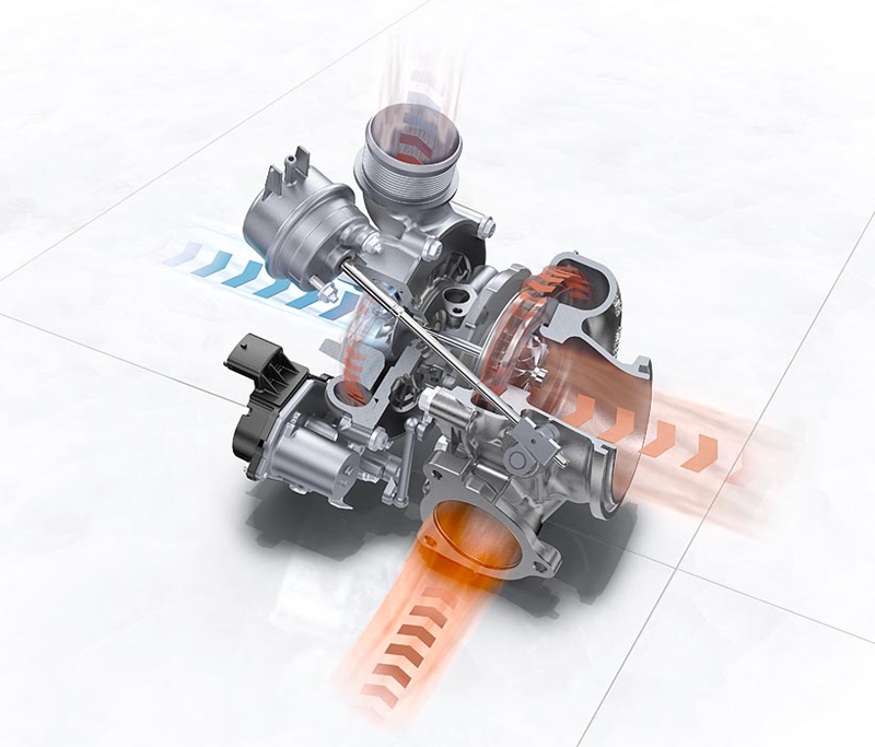 此外,當(dāng)駕駛員選擇Sport或Sport Plus,發(fā)動(dòng)機(jī)處于部分負(fù)載狀態(tài)時(shí),這款渦輪增壓器還擁有一種“預(yù)處理”模式。此時(shí),發(fā)動(dòng)機(jī)的旁通氣門閉合、點(diǎn)火正時(shí)延遲,節(jié)氣門略微打開。這種模式可以提升氣流通量,并提高增壓。因此,一旦駕駛員踩下油門,已經(jīng)過增壓的氣體就可以立刻提供更高的扭矩,從而減少渦輪延遲。