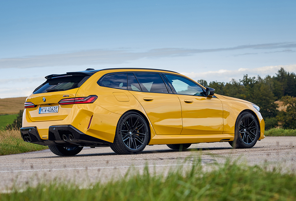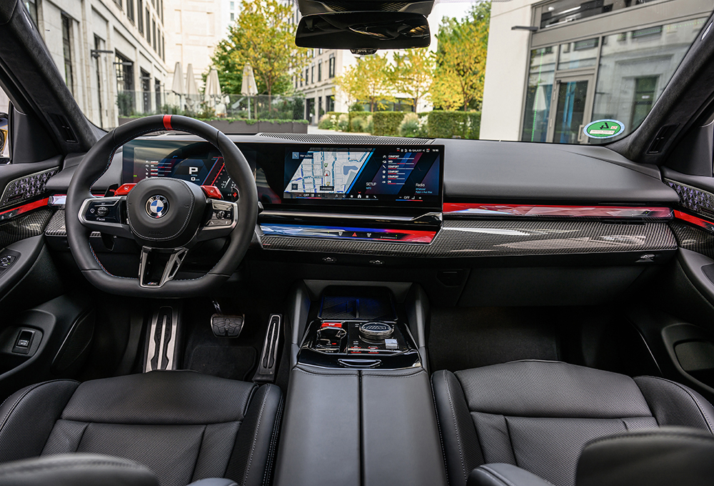 The M5 will charge at up to 7.4 kW through its CCS port, replenishing an empty battery in about two hours. But despite its modest electric range, this PHEV is no green superhero. The Euro-spec sedan we drove guzzled premium unleaded at 10 or 11 mpg as it sawed through the Black Forest. Those ripping runs highlighted surprising agility for such a big-boned sedan, and otherworldly grip from staggered 20- and 21-inch tires, shod with Michelin’s new Pilot Sport S 5 rubber. Optional carbon-ceramic brakes brought this monster to heel.