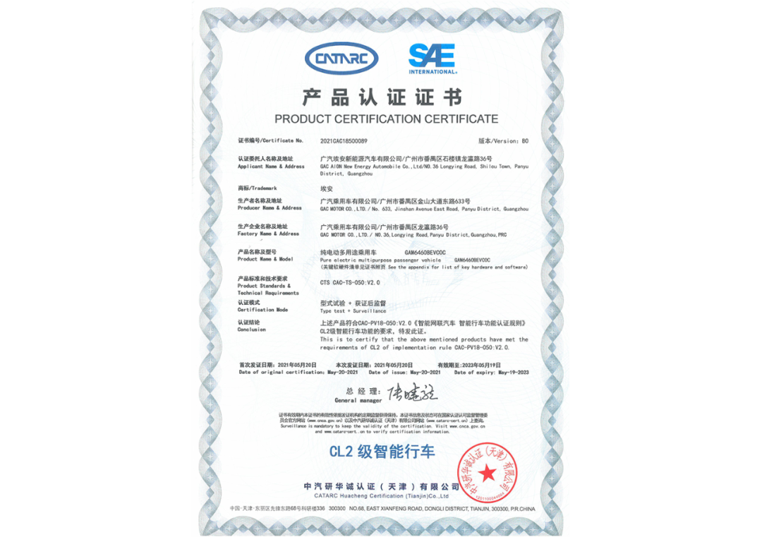 2021年5月22日,在第四屆智能網(wǎng)聯(lián)汽車產(chǎn)品檢測(cè)與認(rèn)證技術(shù)國(guó)際論壇上,SAE International 國(guó)際自動(dòng)機(jī)工程師學(xué)會(huì)(SAE) 與 中國(guó)汽車技術(shù)研究中心有限公司(CATARC) 共同向獲得第二批CL2級(jí)智能駕駛等級(jí)認(rèn)證的企業(yè)頒發(fā)由SAE 與CATARC 雙冠標(biāo)認(rèn)證CL2級(jí)智能行車、CL2級(jí)智能泊車認(rèn)證證書。